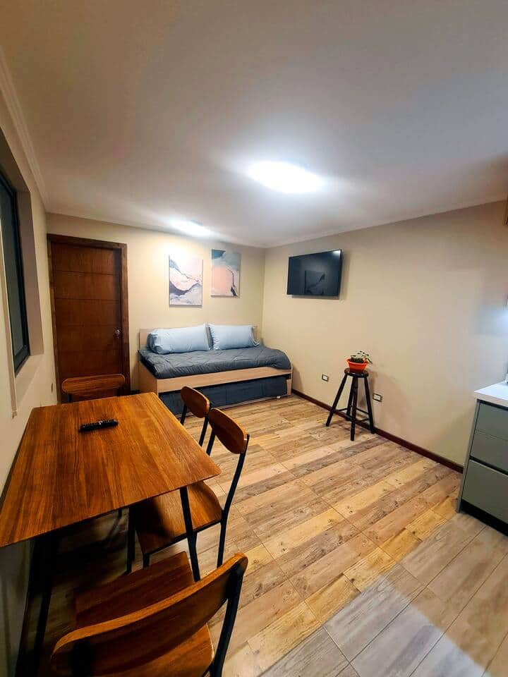 Cómodo departamento interior con entrada independiente, ideal para 3 personas. Espacio interior privado. Jardín y entrada compartida con hostal principal. A minutos del Estadio Nacional y estación de metro. Cercano a avenidas principales, supermercados y áreas verdes. Cuenta con cocina equipada, baño, sala de estar con sofá cama de 2 plazas, dormitorio con cama matrimonial, WiFi, Smart TV y lavadora/secadora.