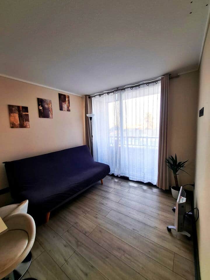 El apartamento tiene una habitación con una cómoda cama box spring de 2 plazas, ideal para descansar. Si necesitas más espacio o vienes con otra persona, también hay un futón en el living, ¡y por supuesto, incluye todo lo necesario para que estén bien abrigados!